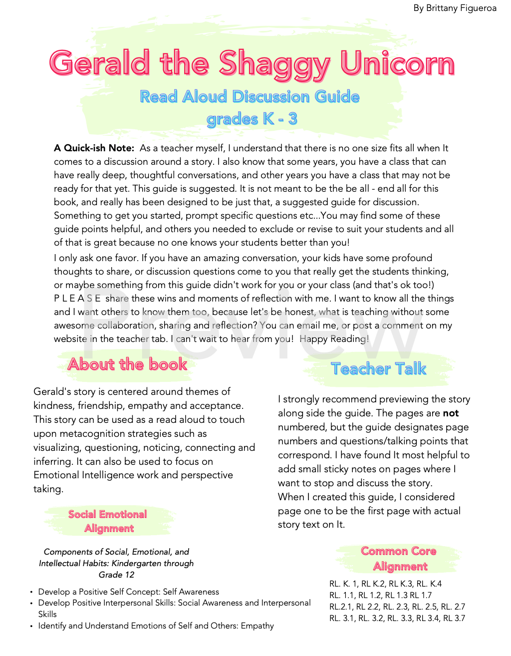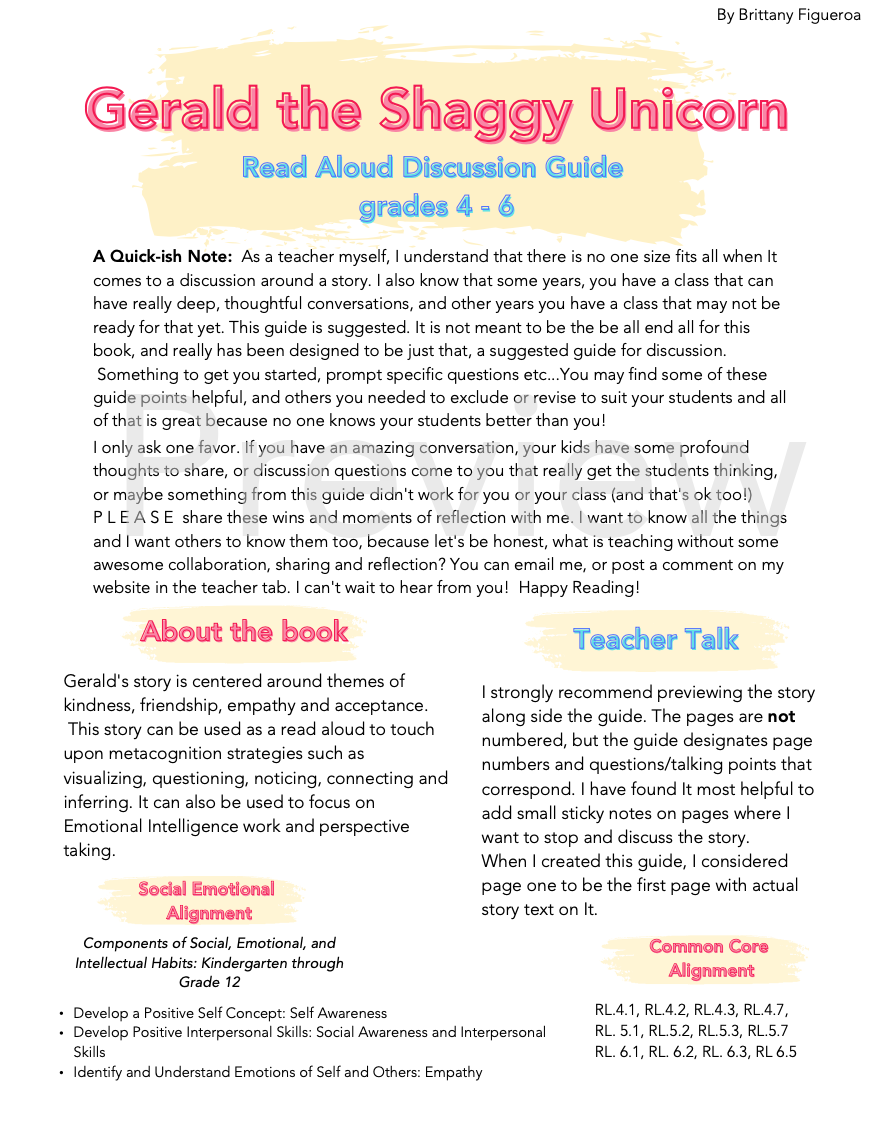 A suggested discussion and activity guide to encourage pre reading, during reading and post reading thinking, connection, and reflection, around illustrations, characters and themes.